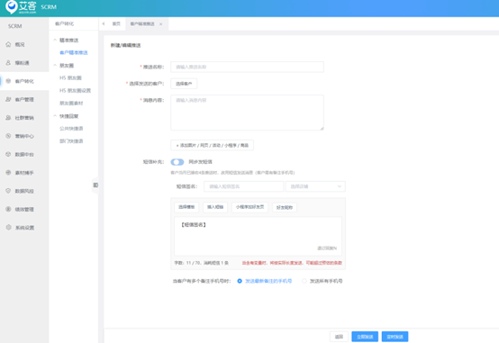 艾客scrm接入短信系統,設置好短信模板后,可應用在以下幾個場景 1.1、導表加粉、訂單加粉、外呼加粉,開啟短信通知后會對需要加粉的手機號先進行短信群發,可以有效提升加粉的通過率。