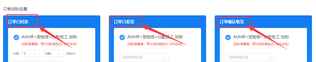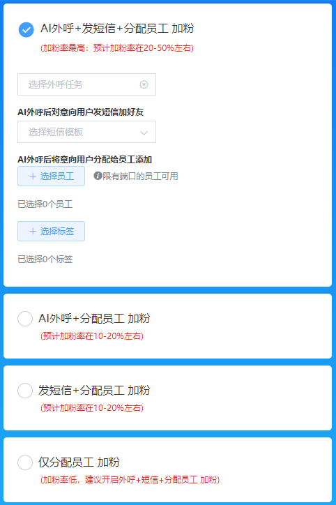 - AI外呼+發短信+分配員工加粉:是指有新的訂單收貨手機號時,會導入手機號進行AI智能外呼,用戶接電話并確定有加好友意向時,接著會給有意向的手機號發送商家指定的短信內容,通過雙重觸達后再分配給選中的員工,員工會收到實時提醒,要求員工實時去添加當前這個手機號為好友.