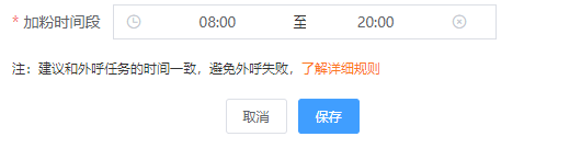 注:當有開啟AI外呼的時候,加粉時間要在AI外呼時間段之內,這是為了避免導入大量手機號,但沒有到外呼時間,導致外呼失敗。建議加粉時間和外呼時間保持一致,避免任務失敗。