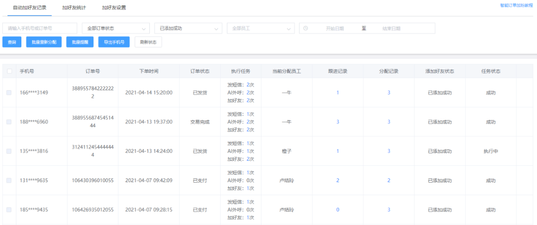 - AI外呼+分配員工加粉:是指有新的訂單收貨手機號時,會導入的手機號進行AI智能外呼,用戶接到電話確定有加好友意向時,接著會將有意向的手機號分配給選中的員工,員工會收到實時提醒,要求員工實時去添加當前這個手機號為好友。