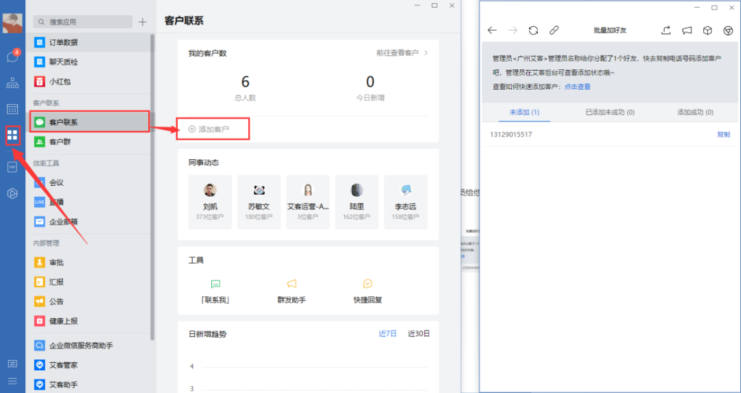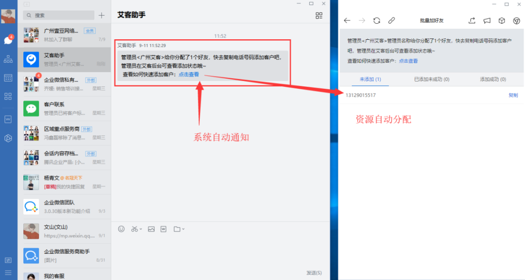在任務時間段內,系統會執行加粉任務,將有意向的手機號通過 “艾客助手” 通知選中的員工。