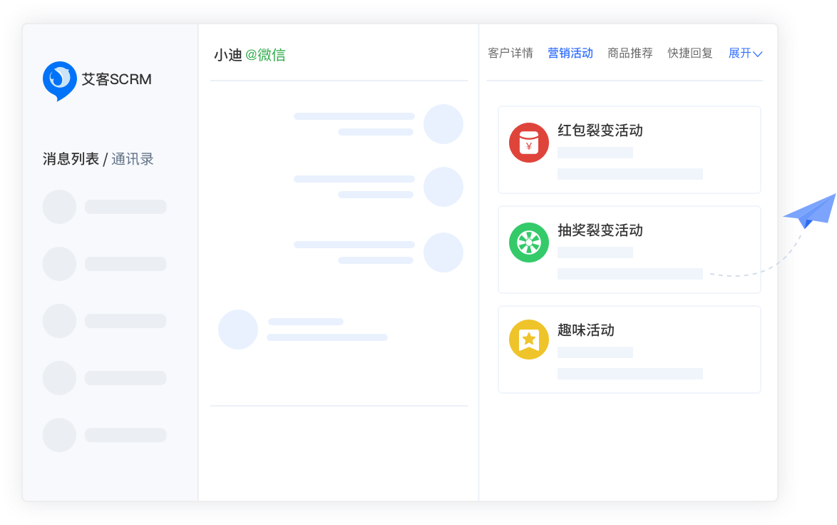 艾客SCRM系統內置客戶裂變模塊,可通過裂變紅包、趣味活動激發客戶進行傳播,老帶新、新拉新,提高私域業績