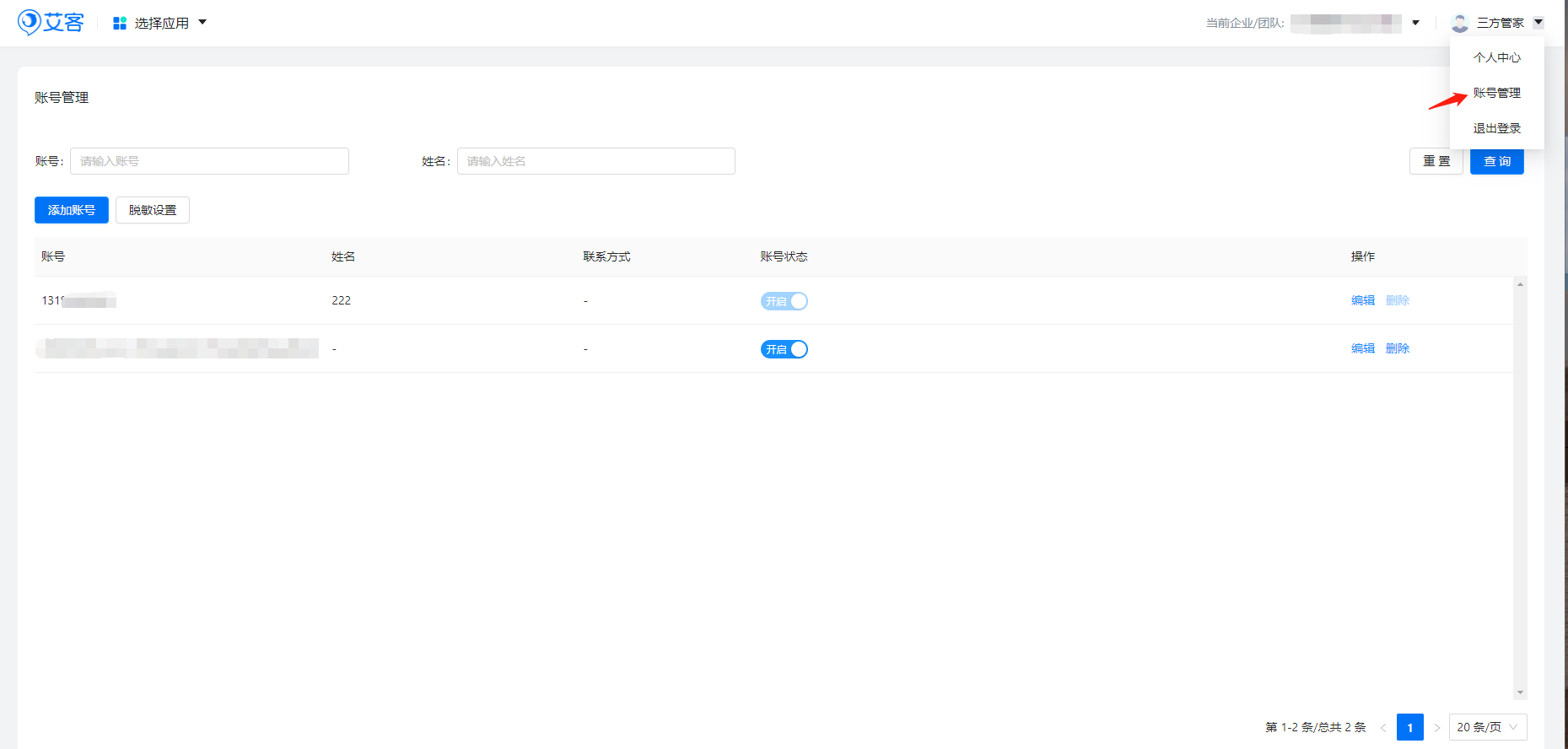 管理員賬號登錄后,在系統右上角點擊【賬號管理】頁面