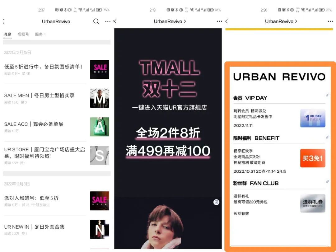 新用戶關(guān)注公眾號【UrbanRevivo】即收到自動歡迎語,針對新用戶推出新人首單95折優(yōu)惠,利用折扣福利,如無門檻20元優(yōu)惠券等吸引用戶加入官方福利社群。