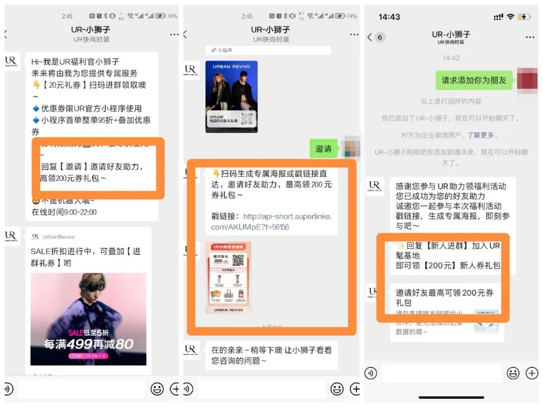 UR以200元券禮包作為鉤子,引導用戶邀請好友添加客服,最終達到裂變拉新的目的。