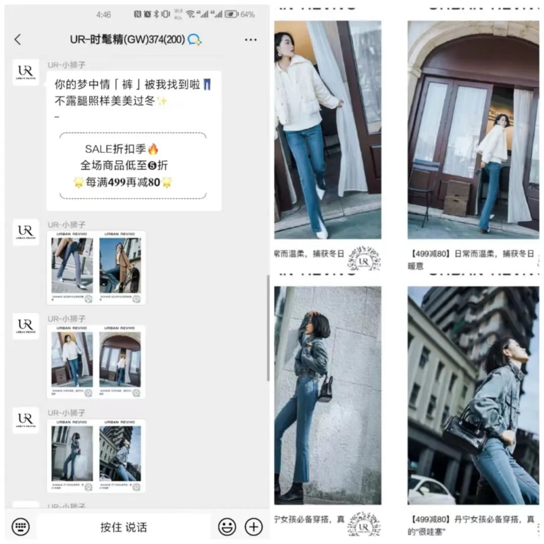 (3)新品上新、活動福利第一時間分享,促進下單轉(zhuǎn)化UR社群的重要內(nèi)容之一就是產(chǎn)品上新和福利活動種草。通過圖文+小程序商城鏈接的組合,讓社群用戶第一時間獲取到上新產(chǎn)品的相關(guān)內(nèi)容。利用模特展示效果圖和限時福利優(yōu)惠折扣,引導用戶直接點擊跳轉(zhuǎn)商城下單,縮短了用戶的決策鏈路。