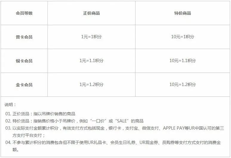 UR共分為四個會員等級:準會員、普卡會員、銀卡會員和金卡會員。成為金卡會員還有機會獲得金卡尊享禮品、金卡專屬社群活動、金卡試衣間、限定城市線下體驗活動等4重福利。