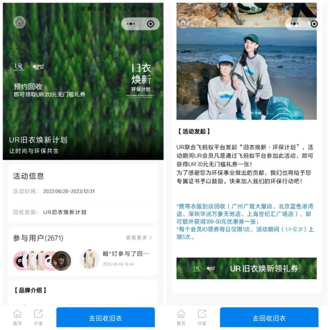 此外,UR還聯(lián)合飛螞蟻平臺發(fā)起“舊衣煥新·環(huán)保計劃”。鼓勵用戶在活動期間通過飛螞蟻平臺參與活動,領(lǐng)取20元無門檻禮券一張。