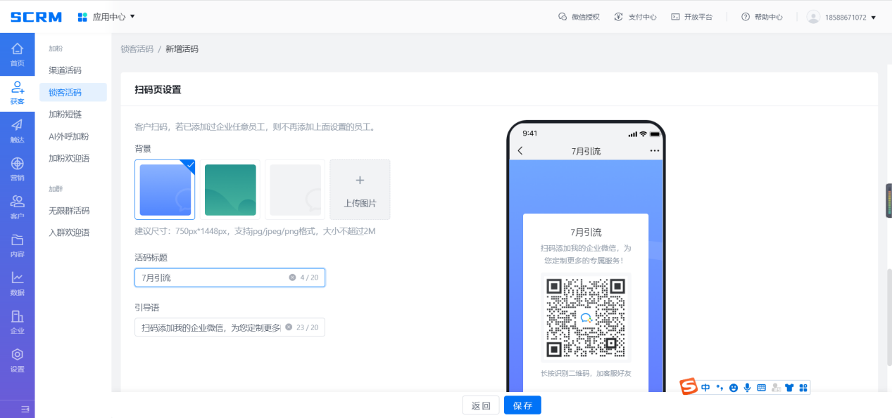 【加粉引流】:給不同來源渠道生成專屬二維碼,客戶掃碼添加員工為好友后,可記錄員工是通過那個二維碼添加的好友。便于統(tǒng)計各個來源的加粉情況,用于不同來源不同運營策略的制定;若需避免重復添加,識別當前掃碼客戶是否已經(jīng)添加過企業(yè)的員工(任意一員工),可以設(shè)置鎖客活碼,客戶掃碼添加時直接跳轉(zhuǎn)到添加過的員工,若沒有添加過,則添加新員工。