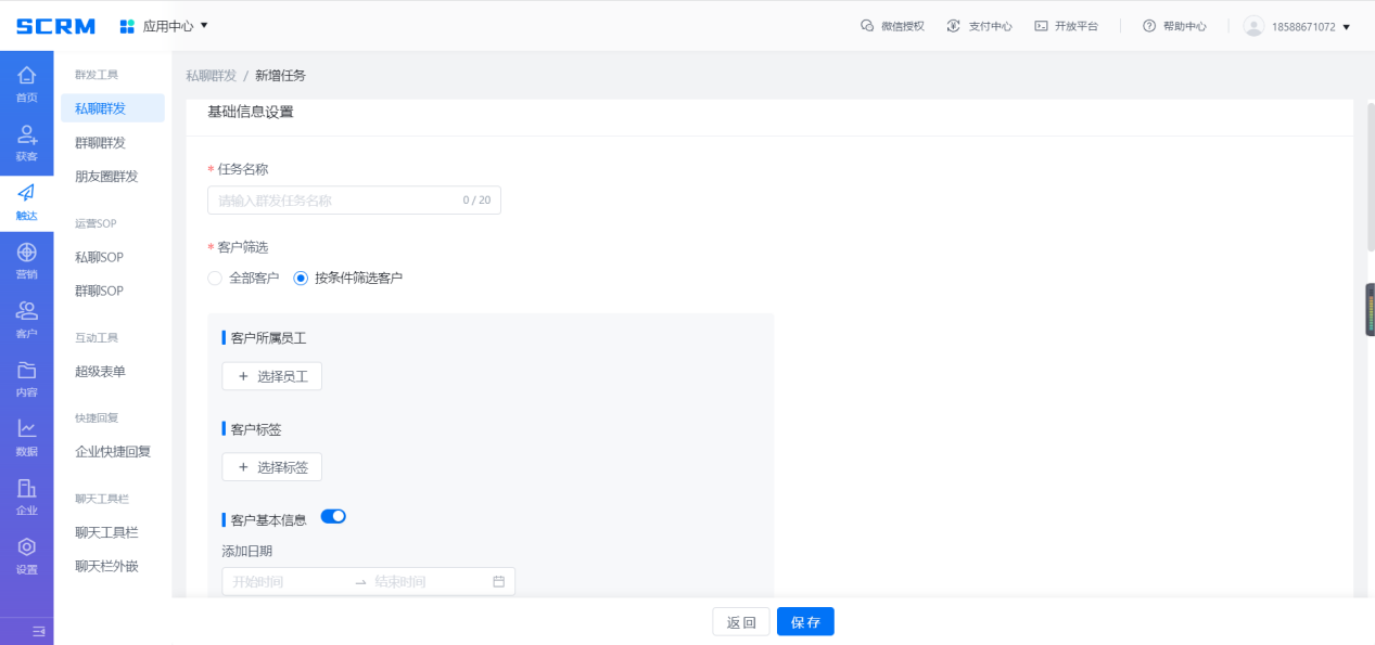 【客戶觸達】:可根據(jù)不同的需求場景和客戶群體設(shè)置群發(fā)消息,助力精準營銷