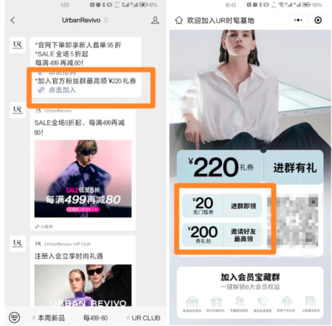 新用戶關(guān)注公眾號(hào)【UrbanRevivo】即收到自動(dòng)歡迎語,針對(duì)新用戶推出新人首單95折優(yōu)惠,利用折扣福利,如無門檻20元優(yōu)惠券等吸引用戶加入官方福利社群