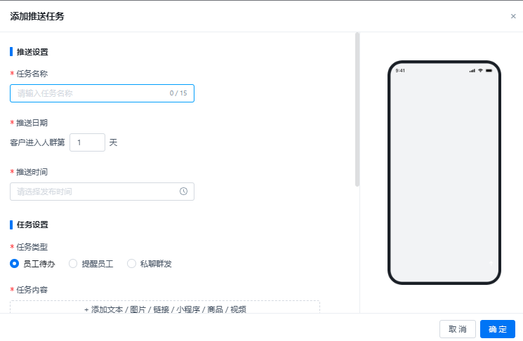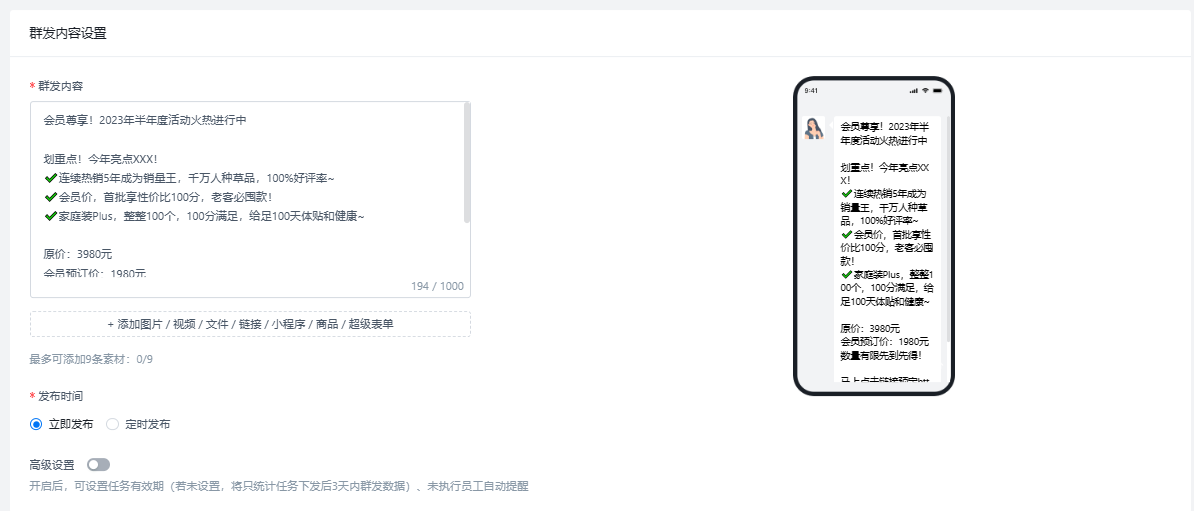 客戶群發(fā):做精準(zhǔn)化營銷的關(guān)鍵在于了解客戶的需求,我們可以通過精細(xì)化的標(biāo)簽實(shí)現(xiàn)千人千面,不同客戶推送定制化的內(nèi)容,同時(shí)也可以選擇排除標(biāo)簽,群發(fā)內(nèi)容可以選擇圖片,文本,視頻,鏈接等,也可以實(shí)現(xiàn)立即發(fā)送或者定時(shí)發(fā)送