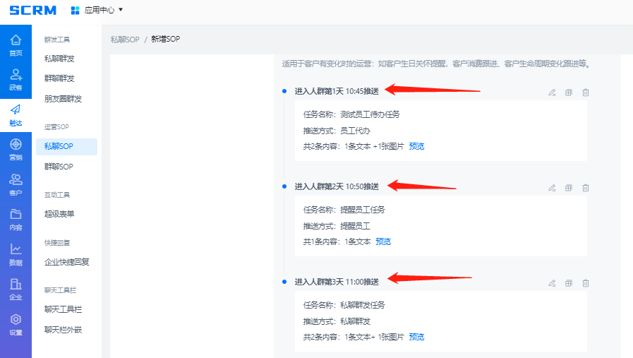 內(nèi)容傳播是營銷的必要要素,我們想讓客戶產(chǎn)生復(fù)購,一定需要先把各項(xiàng)活動(dòng)、優(yōu)惠、福利信息通知到客戶或者各大社群。營銷內(nèi)容可以通過這四個(gè)功能進(jìn)行觸達(dá):客戶SOP、朋友圈、客戶群發(fā)、客戶群群發(fā)。