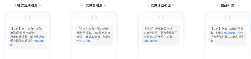 短信加粉可以用于抽獎活動引流、優惠券引流、優惠活動引流、贈品引流等,附帶短鏈接,用戶點擊鏈接即可跳轉加好友。