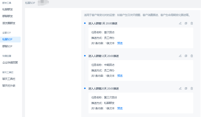 在回訪客戶的次數上,不能太頻繁,頻繁的回訪可能會適得其反,讓客戶產生厭惡。我們建議回訪的次數以三次為宜:第一次,在客戶剛收到產品后(通過自動打標識別客戶的購買時間,預判客戶的使用時間);第二次,客戶使用產品一段時間后(產品使用周期為T,建議0.5T左右進行一次回訪,可借助私聊SOP完成對鏈路的控制);第三次,客戶即將使用完產品(即T-3至T-1天)。