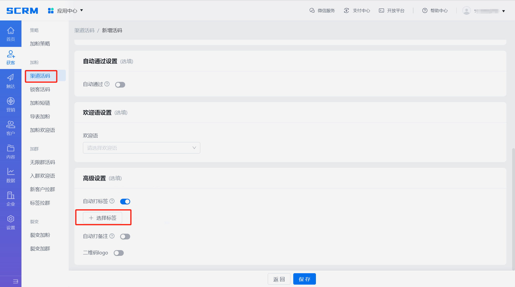 1)活碼自動打標:設置活碼的時候,選擇關聯標簽