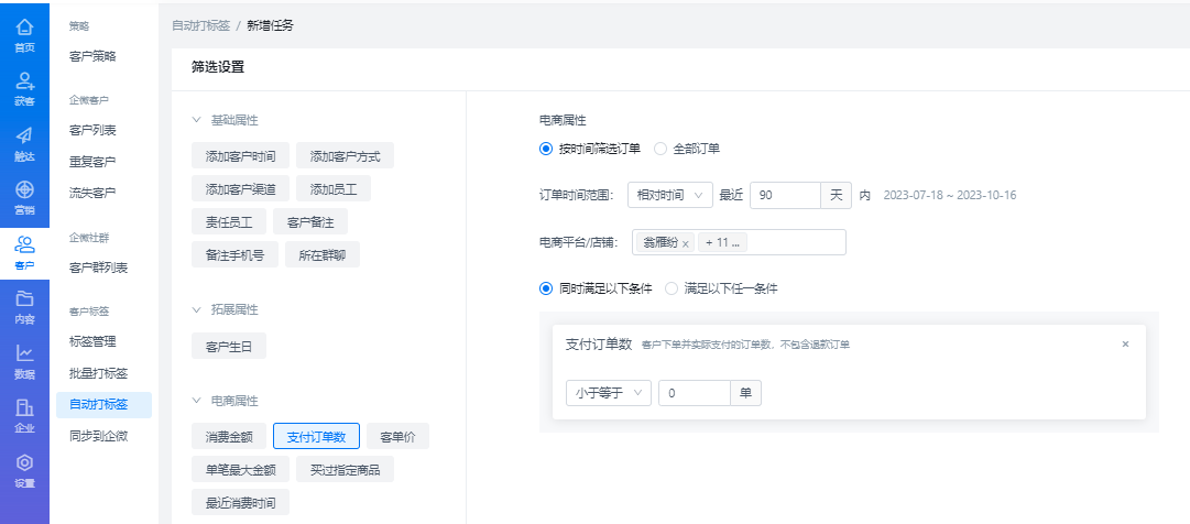 1.篩選客戶,企業銷售人員需要做的第一件事就是將這部分沉默用戶篩選出來,便于之后實施“沉默用戶激活SOP”。通過艾客SCRM,企業可以自定義客戶標簽,進行標簽分類管理,同時可以利用自動打標功能進行人群自動化貼標。