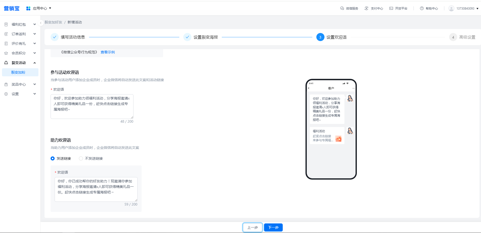 裂變回流無法設置階梯式獎勵,如果我們唯一的助力門檻太高,發起者會很少,就無法實現私域拉新的目標,所以一般建議助力為3-5人,難度不高,既保障了發起者數量同時也保障了一定的拉新人數;活動可設置按訂單金額比例進行返現,無需發貨,無物流和售后問題,但是獲客成本不可控;或指定單品返現,即送實物贈品,此方式獲客成本確定,成本可控,但是需要發貨和售后處理。
