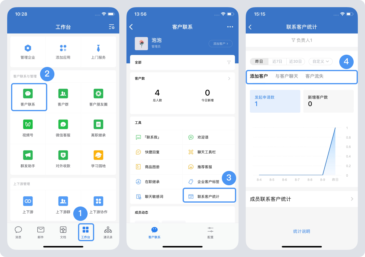 企業微信自帶的功能是無法查看被誰刪除了,想要知道客戶流失情況,只能通過“聯系客戶統計”功能查看客戶流失數據。通過此功能企業還可以查看客戶新增數據以及與客戶聊天數據。