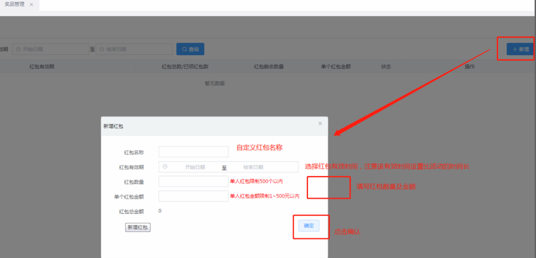 新增獎品類型為紅包,只需要在“吸粉獲客——獎品管理——紅包——新增”即可。在紅包的設置時間上,設置紅包的有效時間要比活動的時間長,因為這樣更加方便參與以及完成裂變任務的人員領取紅包。