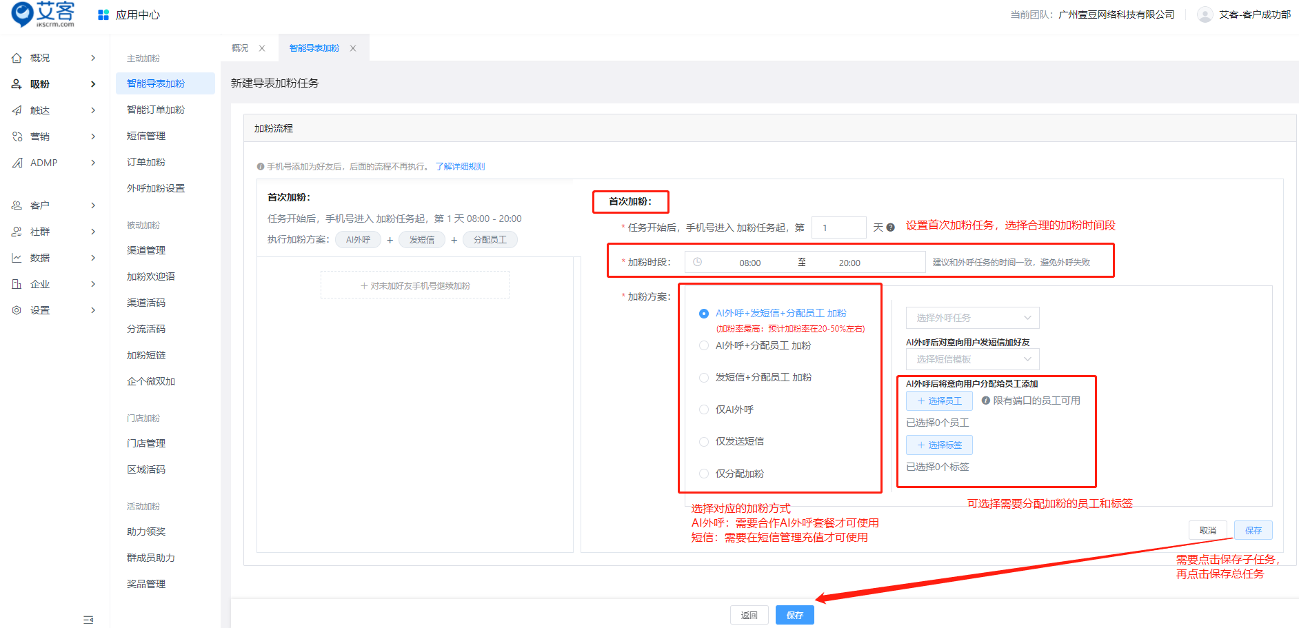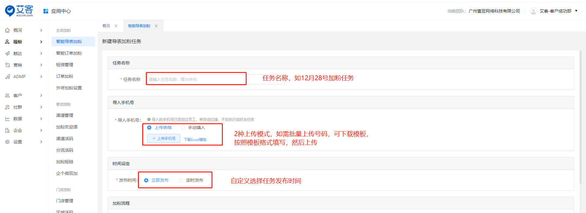 艾客SCRM系統的批量添加好友功能是【智能導表加粉】功能,智能導表加粉功能主要作用在于批量添加好友。