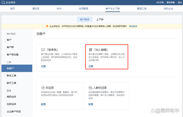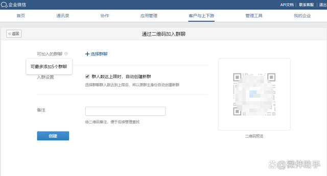 企業微信群活碼創建:打開企業微信后臺,先是從“客戶與上下游”中的“加客戶”選擇“加入群聊”再點擊“創建群聊”選擇“通過二維碼加入群聊”,就可以生成群活碼,如下圖所示: