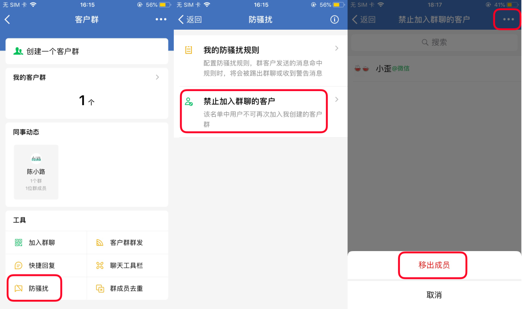 企業(yè)想要把用戶(hù)從黑名單中解除,需要進(jìn)入“工作臺(tái)”中選擇“客戶(hù)群”,再選擇“防騷擾”,找到并進(jìn)入“禁止加入群聊的客戶(hù)”頁(yè)面,就可以看到黑名單所有的用戶(hù)列表了,想要解除黑名單點(diǎn)擊右上角的小三點(diǎn)就可選擇解除拉黑。