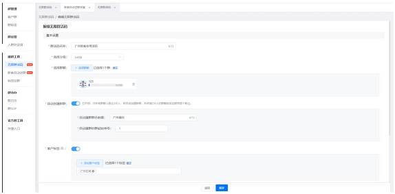 第二,在“無限群活碼”頁面設置群活碼名稱、分組、群聊、自動創建新群群、客戶標簽等內容,點擊保存即可。