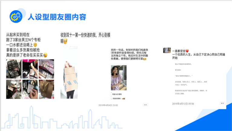人設型朋友圈運用于前期打信任基礎時,人設型內容可以占朋友圈內容大比例,后續進入穩定階段后可減少。人設型朋友圈的核心在于你的定位越精細,你的內容越落地,讓粉絲相信你的確是這樣的人,增加你與他們之間的情感鏈接。發布的策略在于360度無死角地重復用故事形式對自己形象進行展示。