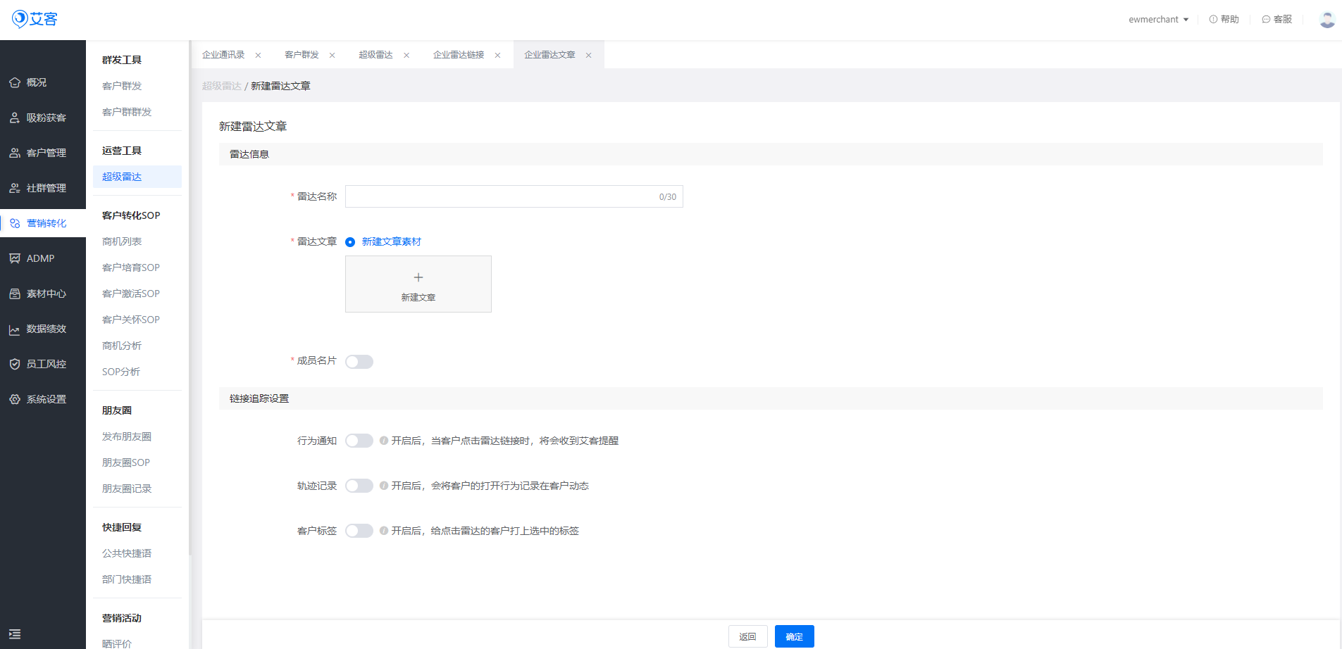 艾客SCRM的超級雷達功能,是管理員在艾客后臺創建的帶追蹤功能的雷達鏈接或者雷達文章,企業員工給客戶發歡迎語的時候,就可以把帶有追蹤功能的雷達鏈接、雷達文章一同發給客戶。