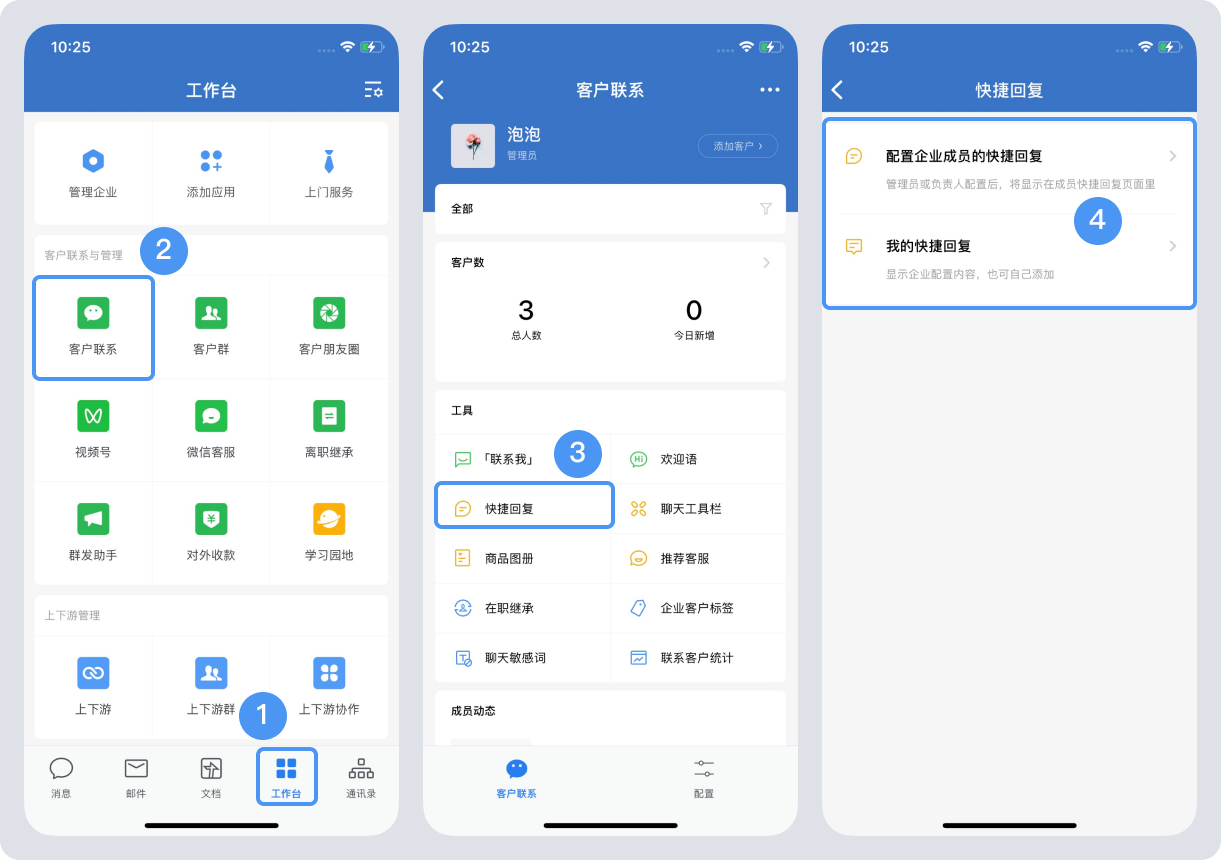 業務負責人或者超級管理員也可以在手機端企業微信配置快捷回復。從“工作臺”——“客戶聯系”——“快捷回復”,就可以配置企業成員的快捷回復了。