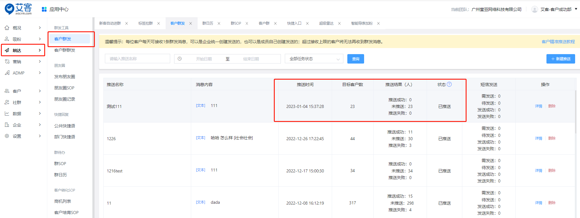 企業想要更加精細化進行群發,可以使用艾客SCRM系統的群發工具,進行定時群發消息以及對客戶群進行群發消息。并且支持查看有多少群主沒有群發,又有多少群聊未送達。對于沒有完成群發任務的群主,可以提醒發送。