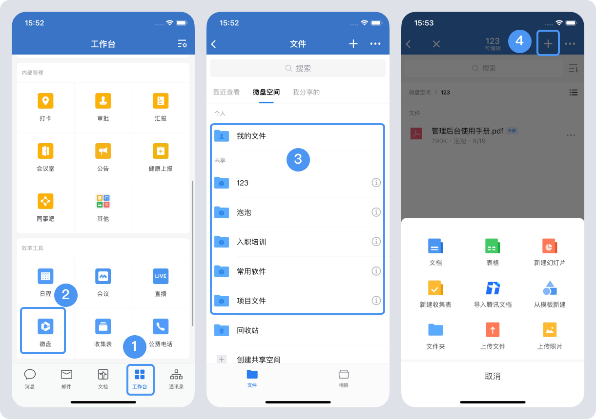 B、登錄手機(jī)端企業(yè)微信,在“工作臺(tái)”——“微盤”——“文件”——右上角的“+”就可以新建文檔了。
