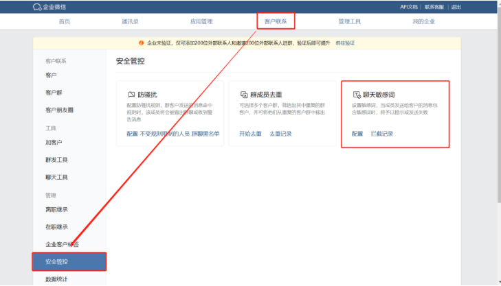企業微信敏感詞攔截設置起來很簡單,只需要管理員登錄企業微信后臺,在【客戶聯系】—【安全管控】中即可配置規則適用的員工或客戶,這樣能攔截“加微信”等常見敏感表述,還可以阻止員工發送手機號、紅包等違規內容。