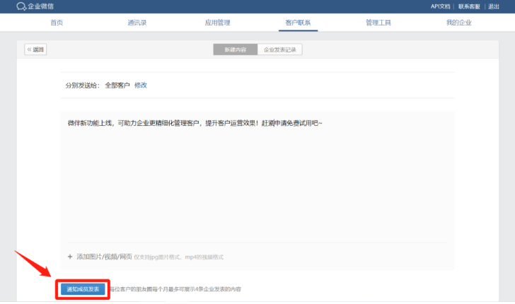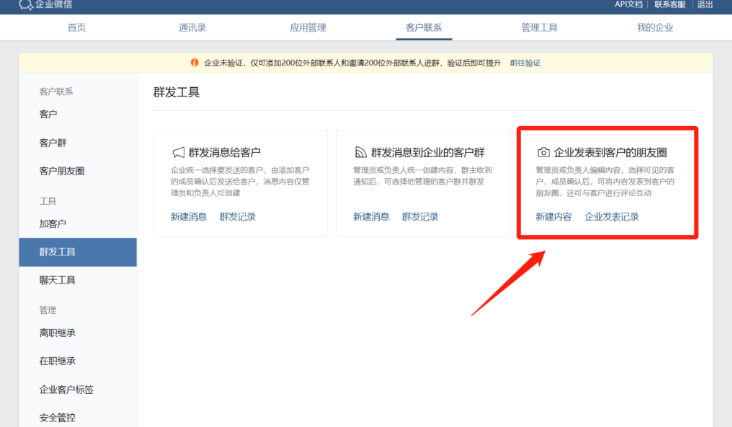 企微朋友圈可以和個微朋友圈同步,企業有新活動或者新產品上新推廣時,管理員可以登錄企微管理后臺,在【客戶聯系】—【群發工具】中找到【企業發表到客戶的朋友圈】。