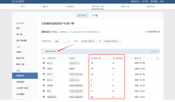 如果使用企微在職繼承,需要管理員在企微后臺【在職繼承】中將客戶分配給其他成員。