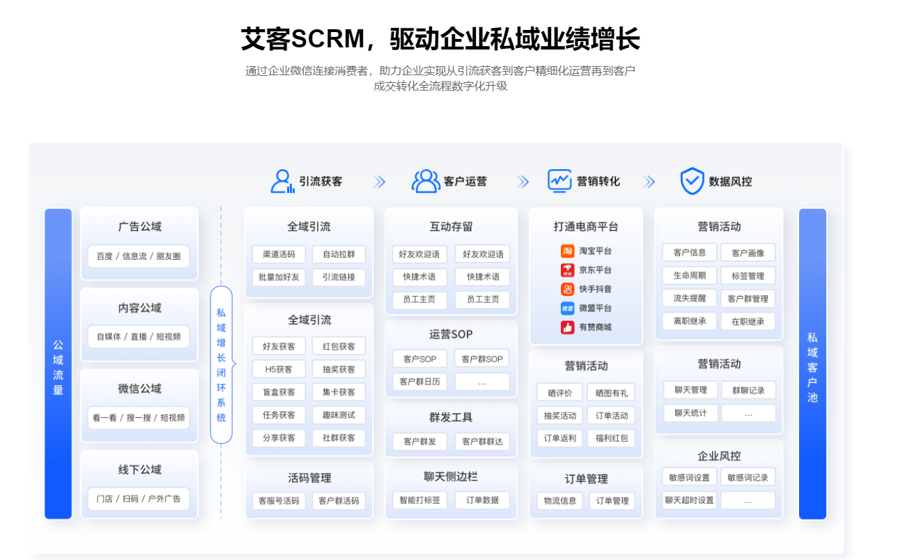 關于企微營銷系統哪個好?這里小艾推薦大家使用企業微信服務商——艾客SCRM系統。艾客深耕于做私域7余年,具備豐富的經驗,服務來自全國各地超1000+企業、品牌商,幫助其高效精細化運營私域,有效提升營收額,獲得眾多企業的認可及青睞。構建從引流獲客、私域留存、營銷轉化、數據風控等全方位打造私域營銷閉環。