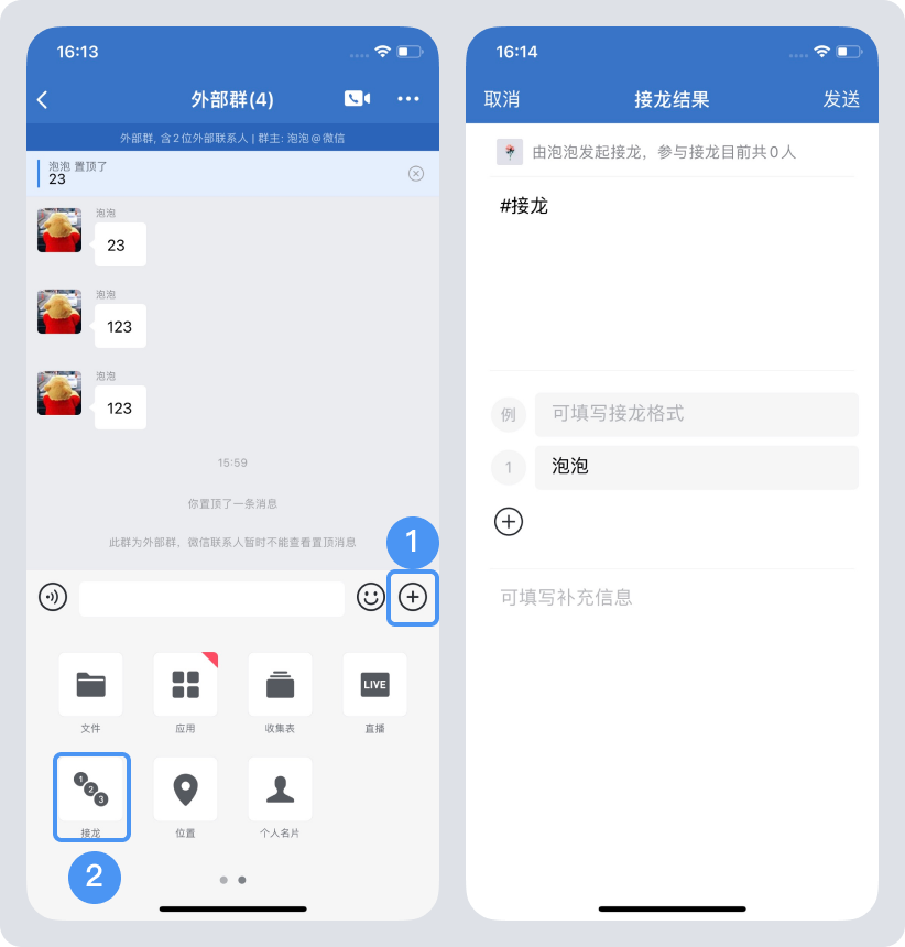 1、手機(jī)端:手機(jī)登錄企業(yè)微信,進(jìn)入外部客戶群群聊會(huì)話界面,點(diǎn)擊輸入框最右邊的“+”,選擇下方的“接龍”圖標(biāo),就可以發(fā)起接龍了。而群內(nèi)成員想要參與接龍,直接點(diǎn)發(fā)起人發(fā)起接龍下方的“參與接龍”即可參與。
