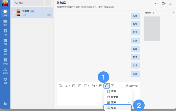 2、電腦端:登錄電腦端企業(yè)微信,進(jìn)入外部群群聊頁面,在輸入框上面的工具欄中點(diǎn)擊圓形內(nèi)有三個(gè)點(diǎn)的那個(gè)符號,從這些應(yīng)用中找到“接龍”選項(xiàng),點(diǎn)擊接龍就可以發(fā)起接龍了。