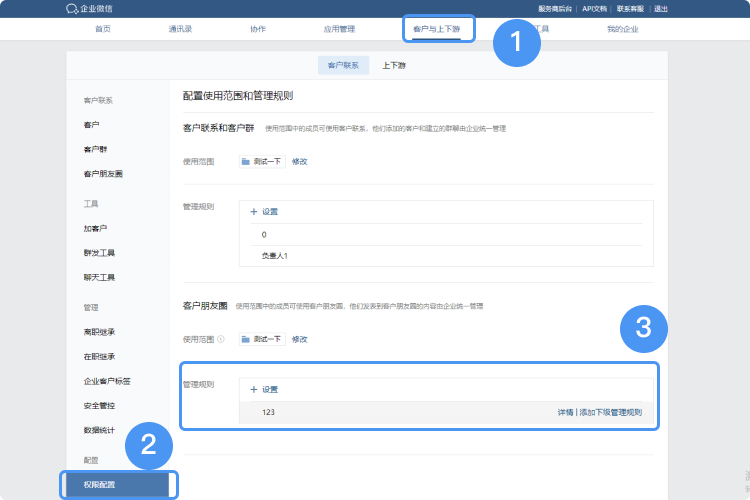 1、電腦端:企業(yè)微信管理員登錄企業(yè)微信后臺,“客戶與上下游”——“客戶聯(lián)系”——“權(quán)限配置”——“朋友圈管理規(guī)則”,就可以對管理規(guī)則進行設(shè)置或者添加下級管理規(guī)則了。
