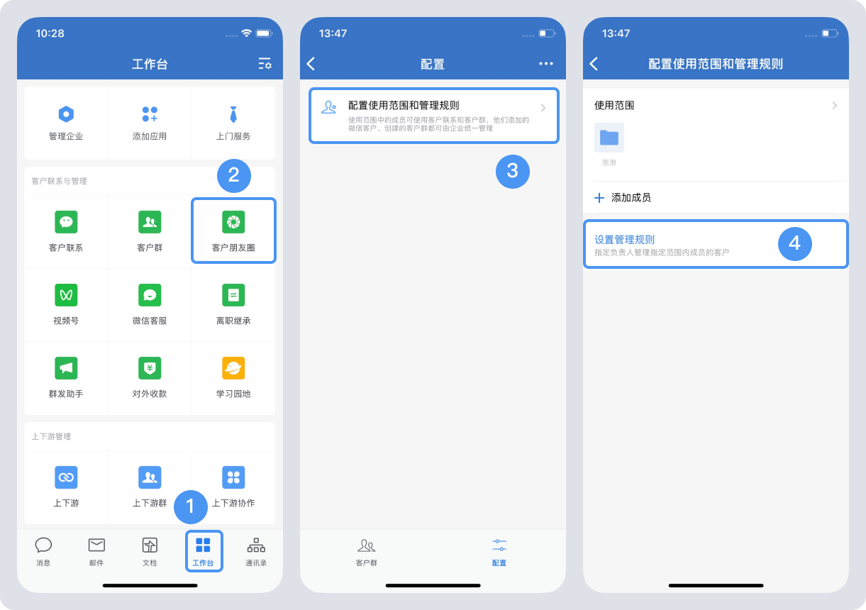 3、手機端:手機登錄企業(yè)微信,在“工作臺”——“客戶朋友圈”——“配置”——“配置使用范圍和管理規(guī)則”,這個選項的入口給企業(yè)成員添加朋友圈的使用權(quán)限即可。
