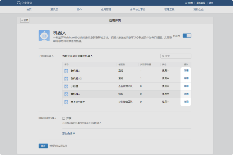 2、企業(yè)微信管理員登錄企業(yè)微信管理后臺,在“應用管理”——“自建”——“機器人”,里選擇停用機器人即可。