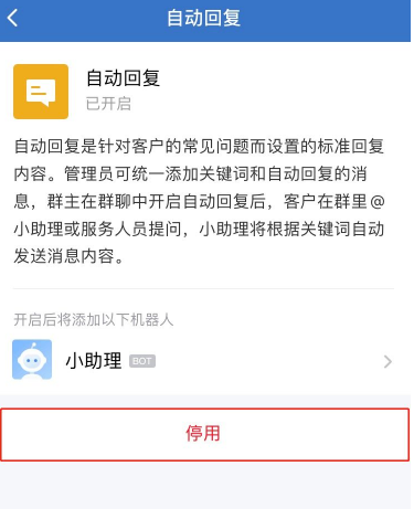 3、客戶群群主,進入群聊天頁面的自動回復功能,選擇停用“自動回復”功能,那么群內機器人也會被停用。