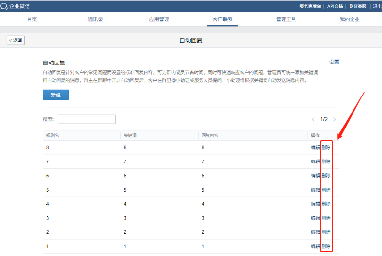 4、企業(yè)微信管理員也可以登錄企業(yè)微信后臺,選擇“客戶聯(lián)系”——“聊天工具”——“自動回復” ,將里面設置的自動回復規(guī)則刪除掉也可以停用機器人。