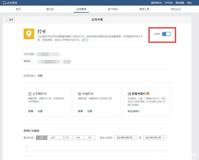 企業想要使用企業微信的打卡功能,需要企業微信管理員先在企業微信管理后臺把打卡功能打開。打開步驟如下:
