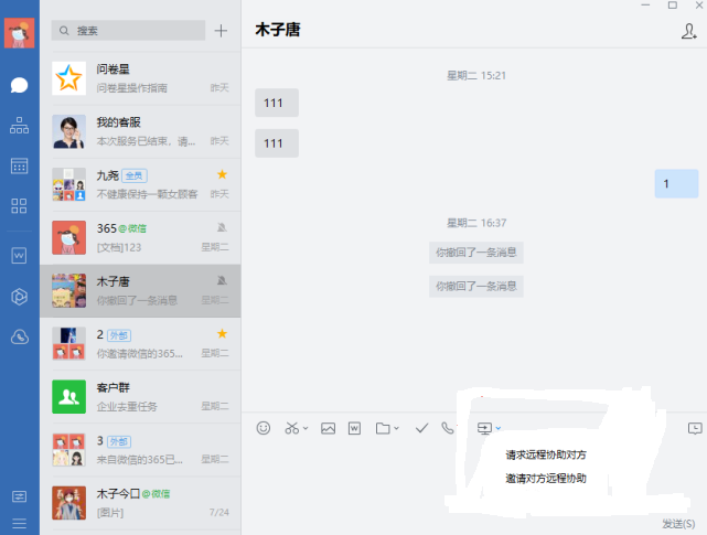 打開后,我們的電腦端聊天窗口中才會出現遠程協助功能。這時我們選擇控制他人電腦,也可以邀請他人控制我們的電腦,具體如下圖: