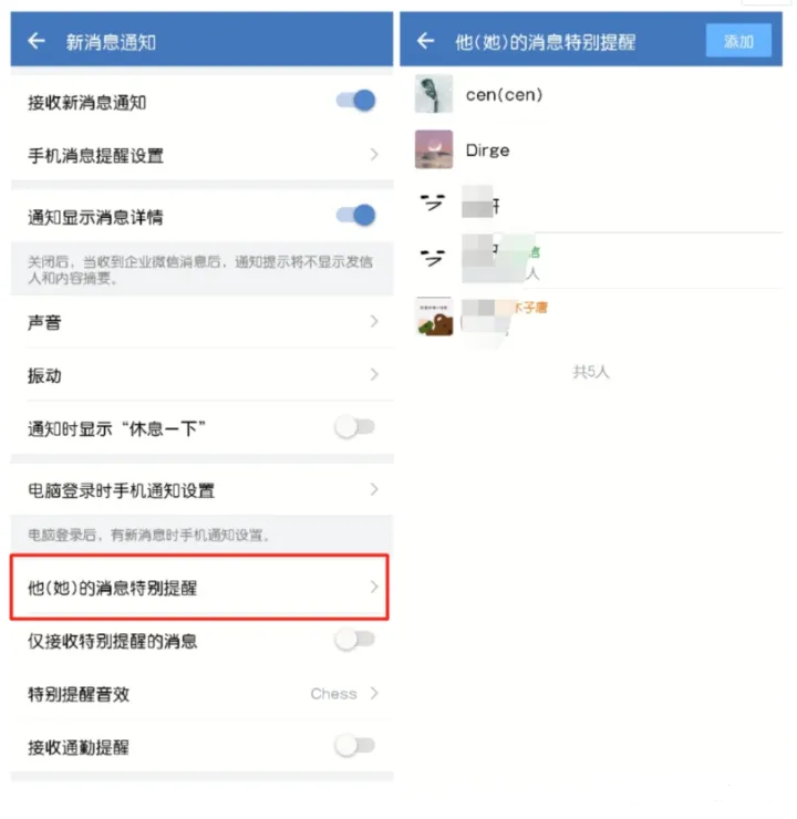 (1)從企業微信手機端的【我】-【設置】-【新消息通知】-【他的消息特別提醒】中進入消息通知頁面,在這里就可以看到添加特殊提醒的選項了,我們可以選取需要設置提醒的聯系人。