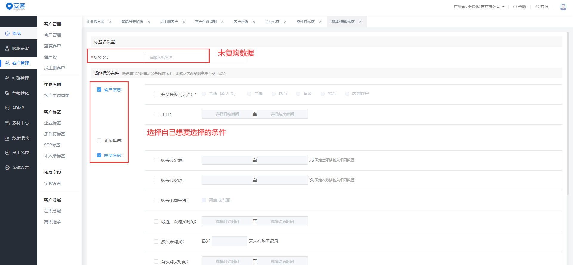 企業(yè)可以通過客戶電商信息、互動信息、自定義字段信息等作為條件篩選出精準(zhǔn)客戶人群,并給這批客戶自動打上標(biāo)簽。
