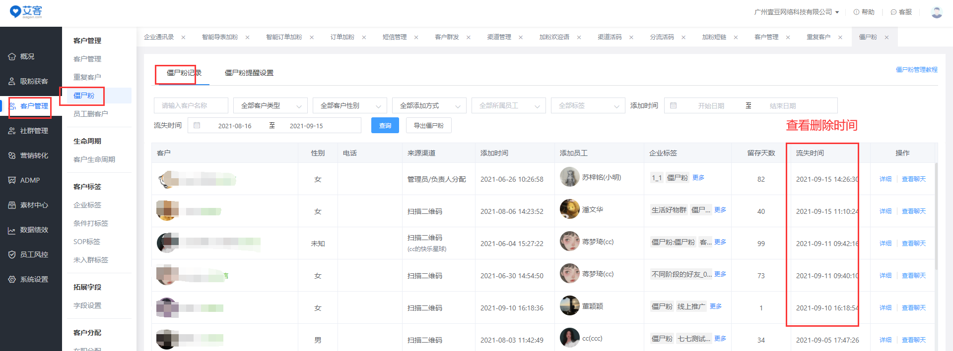 而且,艾客的【僵尸粉】功能可以把客戶刪除員工的數據全部記錄下來。企業可以通過艾客后臺進行查看。
