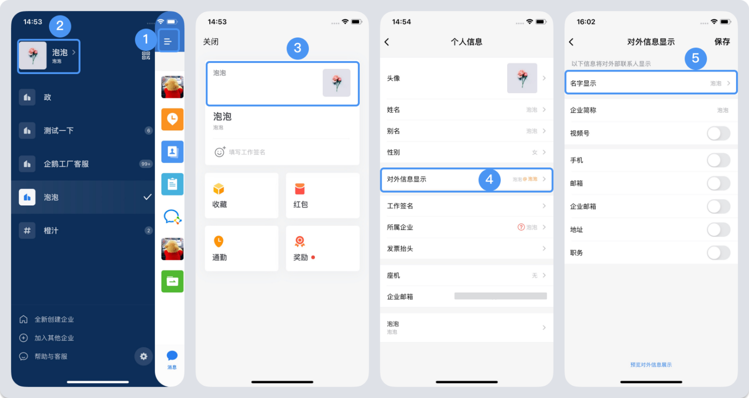 登錄企業(yè)微信手機(jī)端,點(diǎn)擊“我”進(jìn)入到個(gè)人信息頁面,就可以對(duì)“別名”或者“對(duì)外信息顯示”進(jìn)行相關(guān)的設(shè)置了。